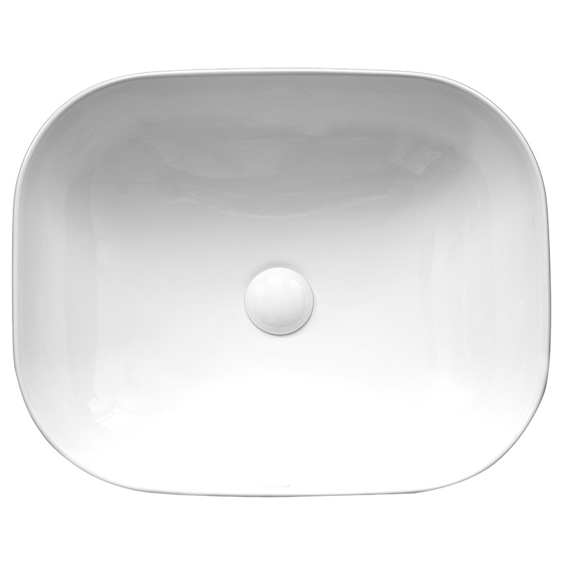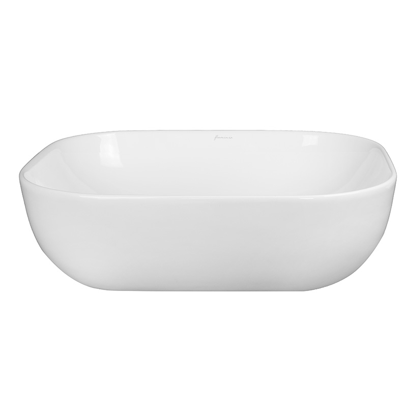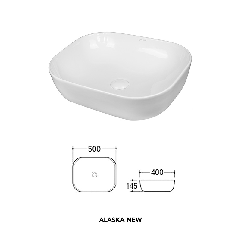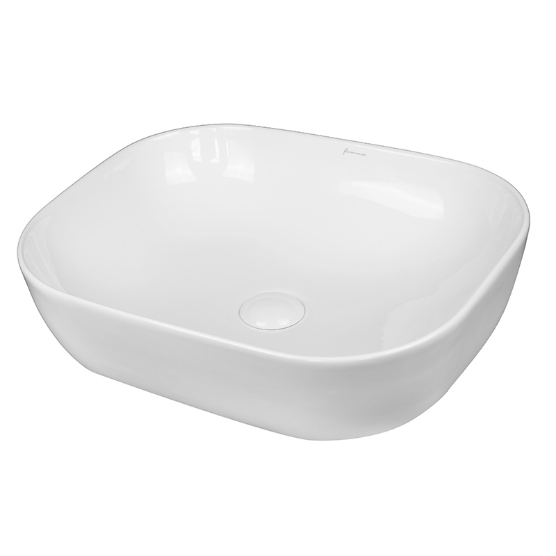 Lavoar pe blat dreptunghiular Fluminia Alaska New, 50 x 40 cm, alb, din ceramică sanitară, fără orificiu pentru baterie și fără preaplin. Design modern, ideal pentru băi elegante.
