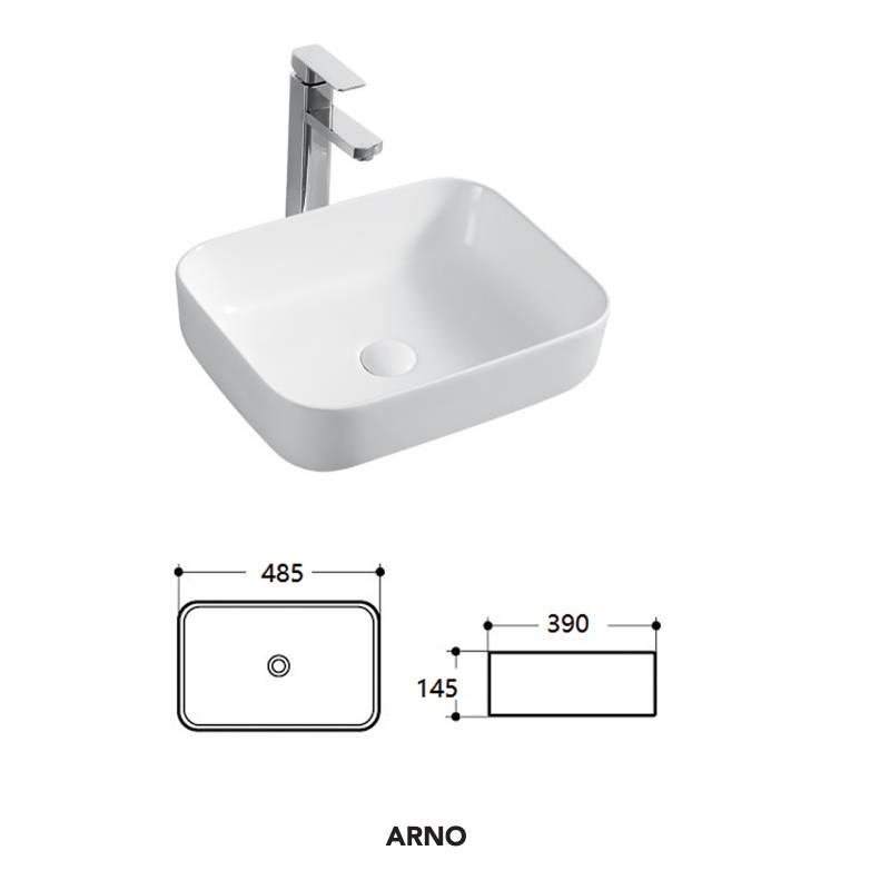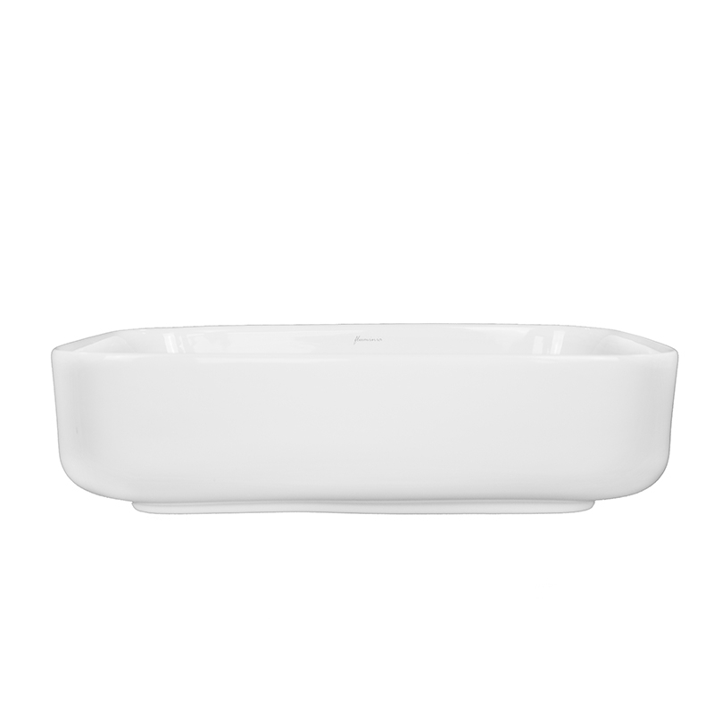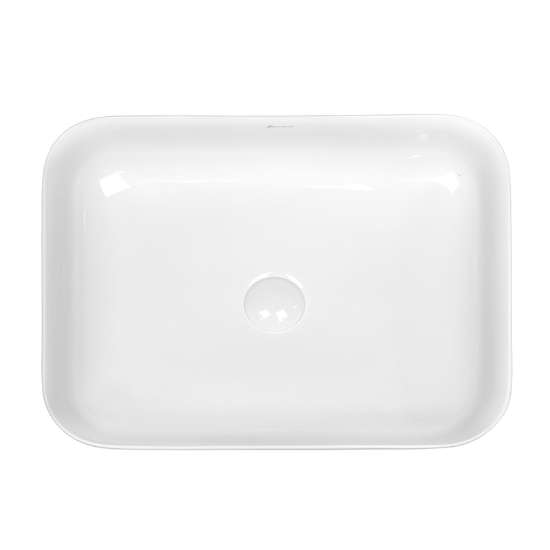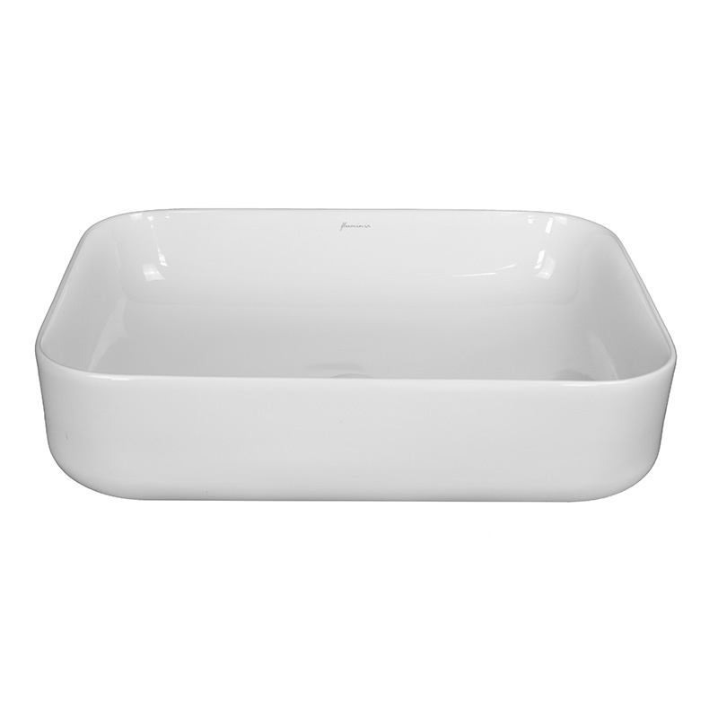 Lavoar pe blat Fluminia Arno, dreptunghiular, fără orificiu pentru baterie și preaplin. Design modern alb, compatibil cu ventil și sifon separat.
