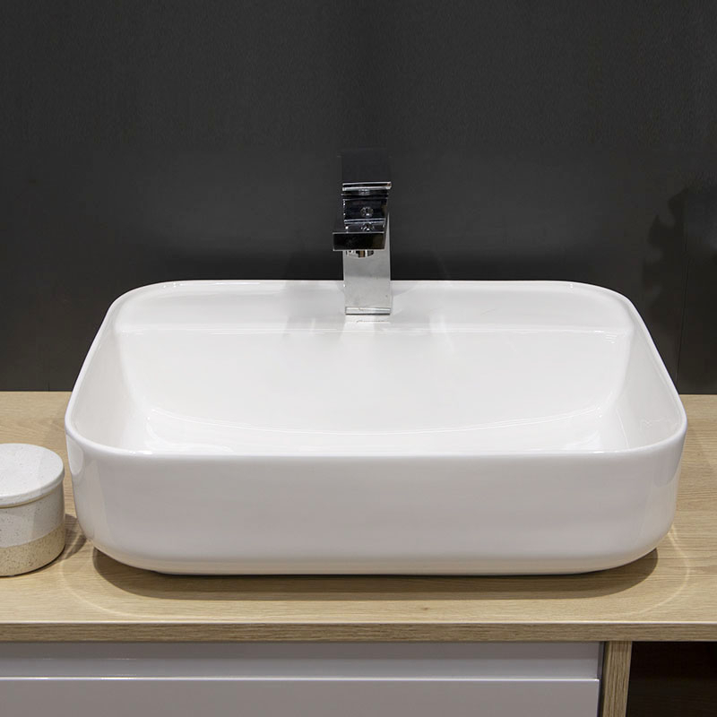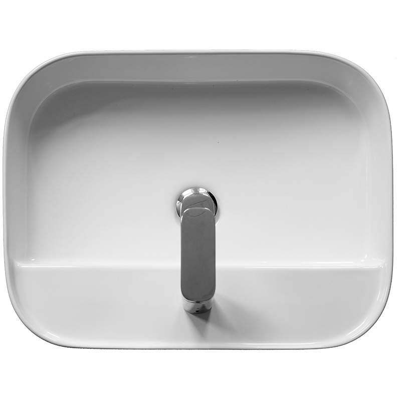 Lavoar pe blat Fluminia Juno, dreptunghiular, 55 x 45 cm, alb, cu orificiu pentru baterie și fără preaplin. Fabricat din ceramică sanitară, design modern și elegant.