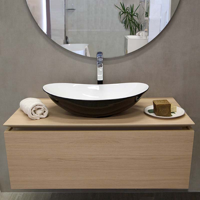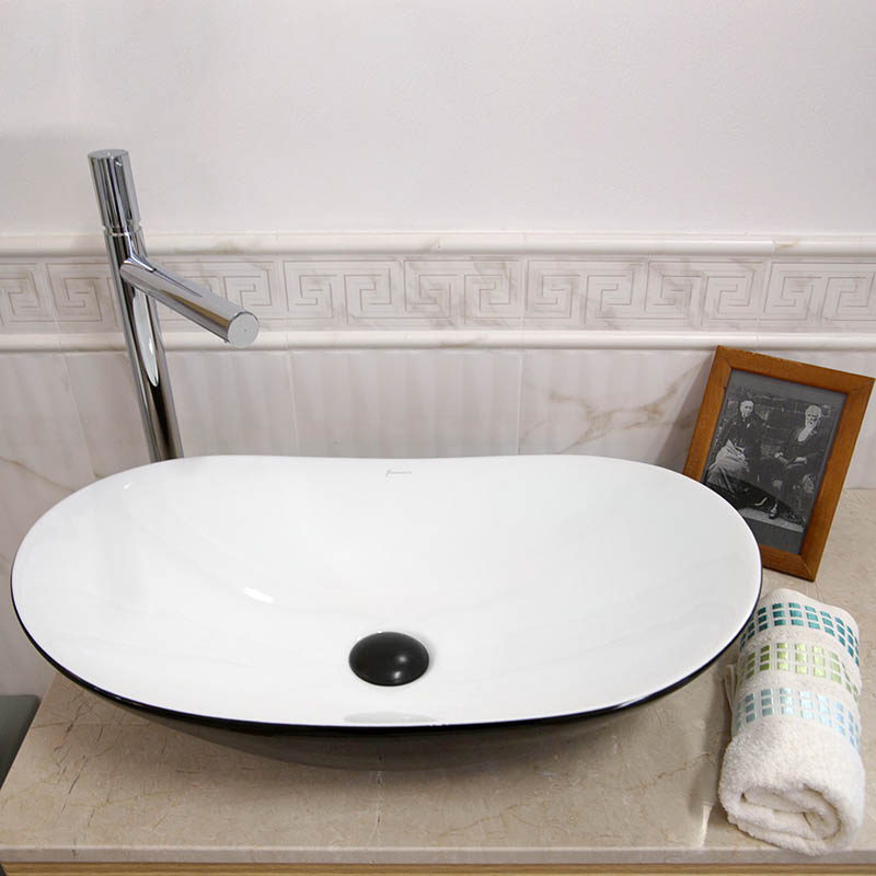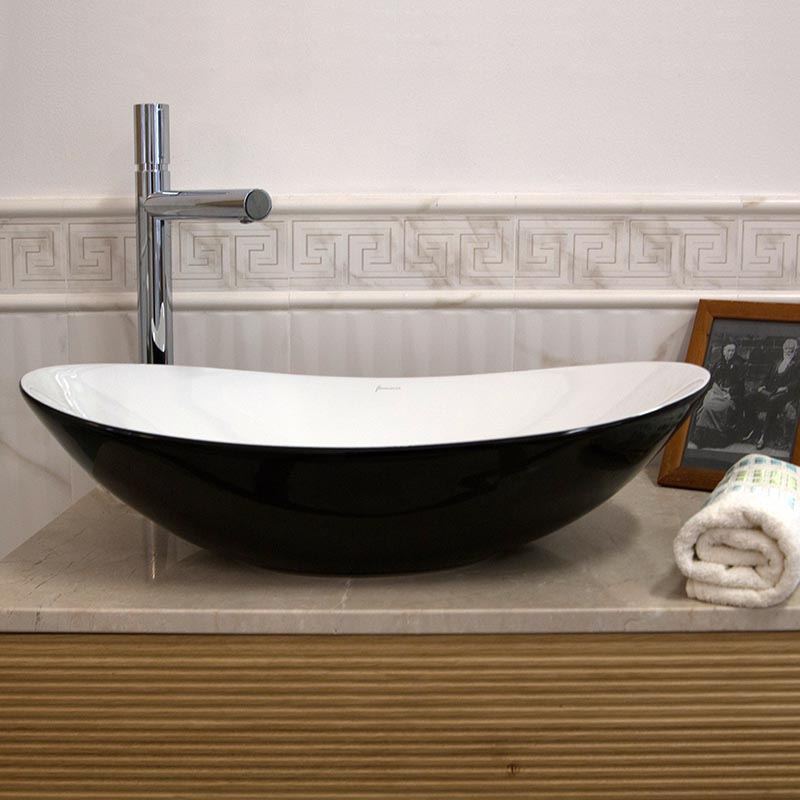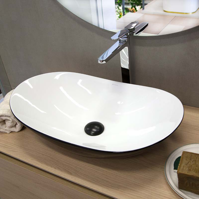 Lavoarul pe blat Fluminia My Night combină eleganța formei ovale cu un design modern bicolor alb-negru, ideal pentru băi cu stil contemporan.