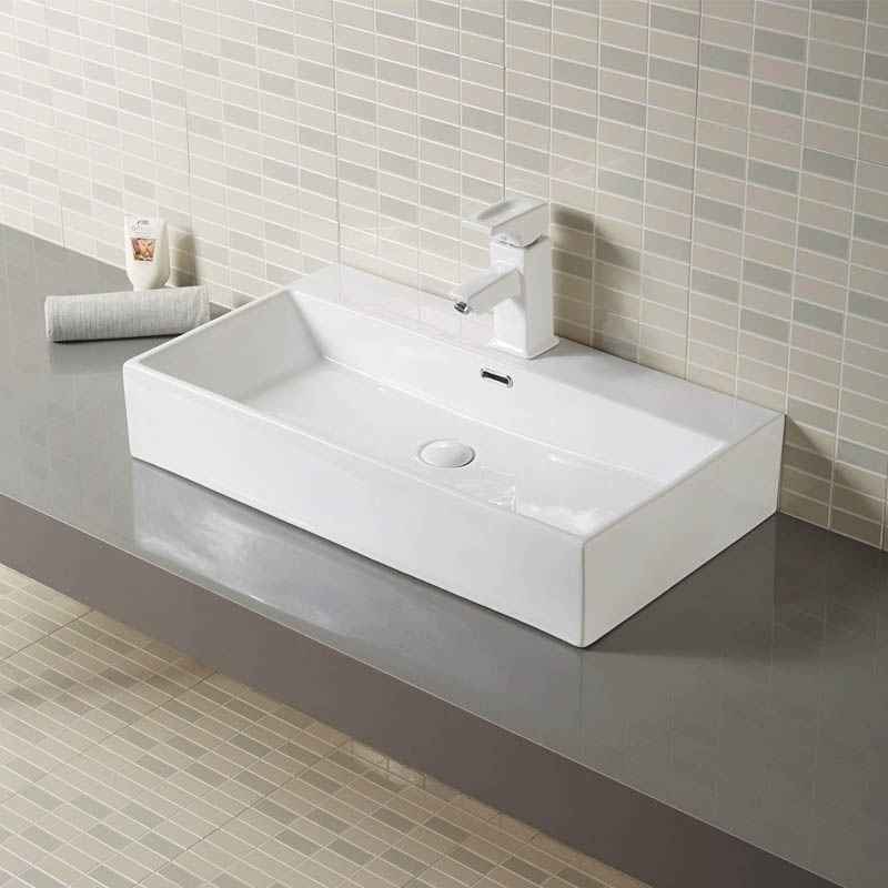 Lavoar pe blat Fluminia Pluto-60, dreptunghiular, 60 x 35 cm, alb, cu orificiu pentru baterie și preaplin. Fabricat din ceramică sanitară, design modern și practic.