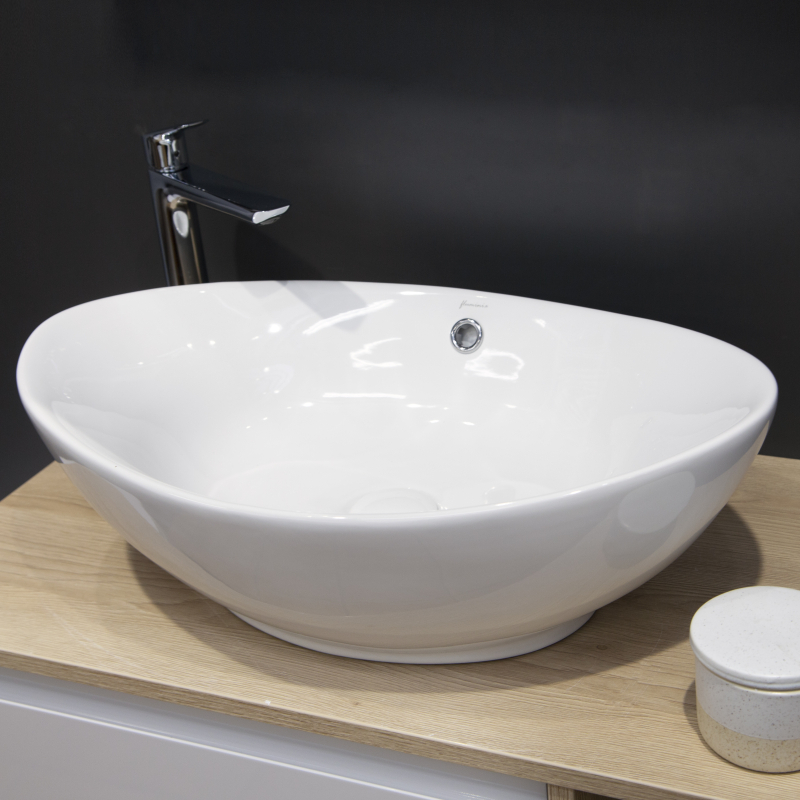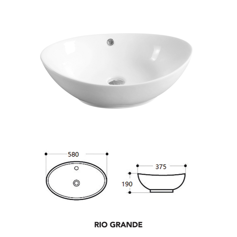 Lavoar pe blat Fluminia Rio Grande, oval, 58 x 37,5 x 19 cm, ceramică albă premium, cu preaplin, montaj pe blat, fără orificiu pentru baterie.