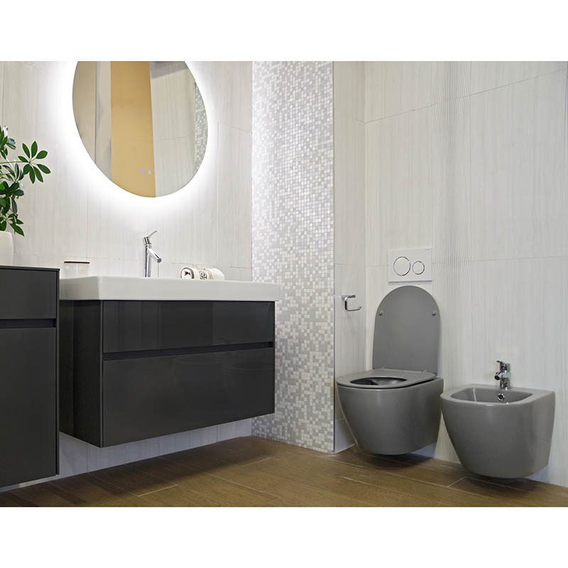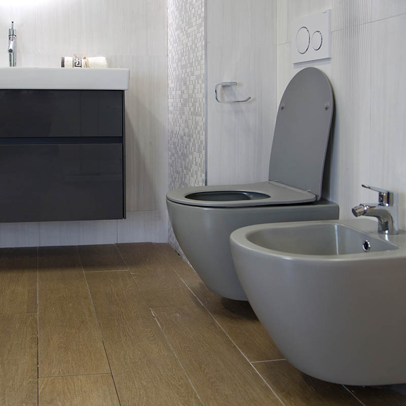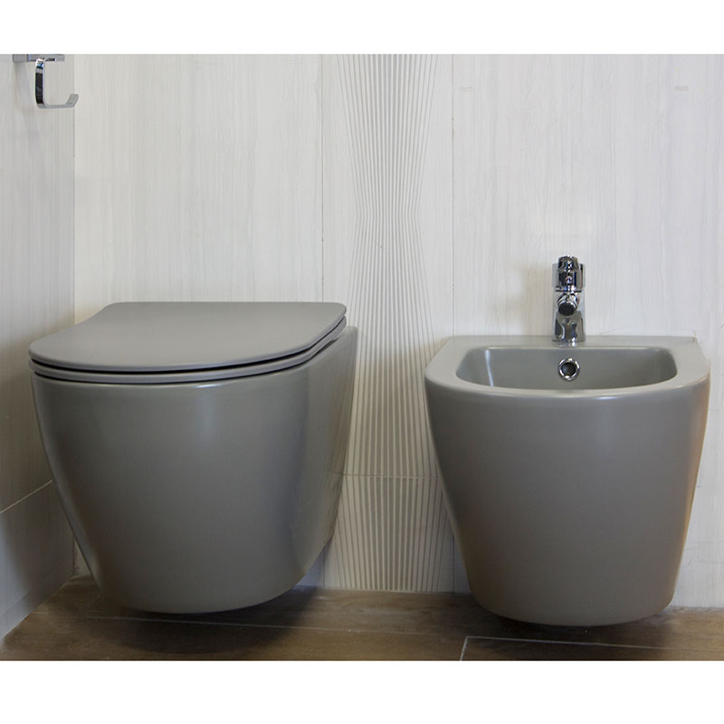 Bideul suspendat Fluminia Alfonzo, cu finisaj elegant gri mat, combină design modern și funcționalitate superioară. Este prevăzut cu orificiu pentru baterie și orificiu de preaplin, oferind montaj flexibil și ușor. Fixarea este ascunsă, iar bideul este deschis pentru montarea facilă a robineților colțari. Fabricat din porțelan sanitar de calitate, rezistă în timp și este ușor de întreținut.