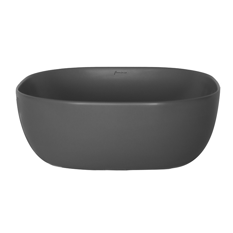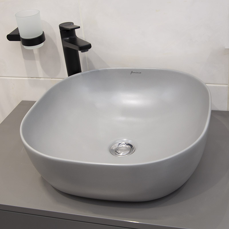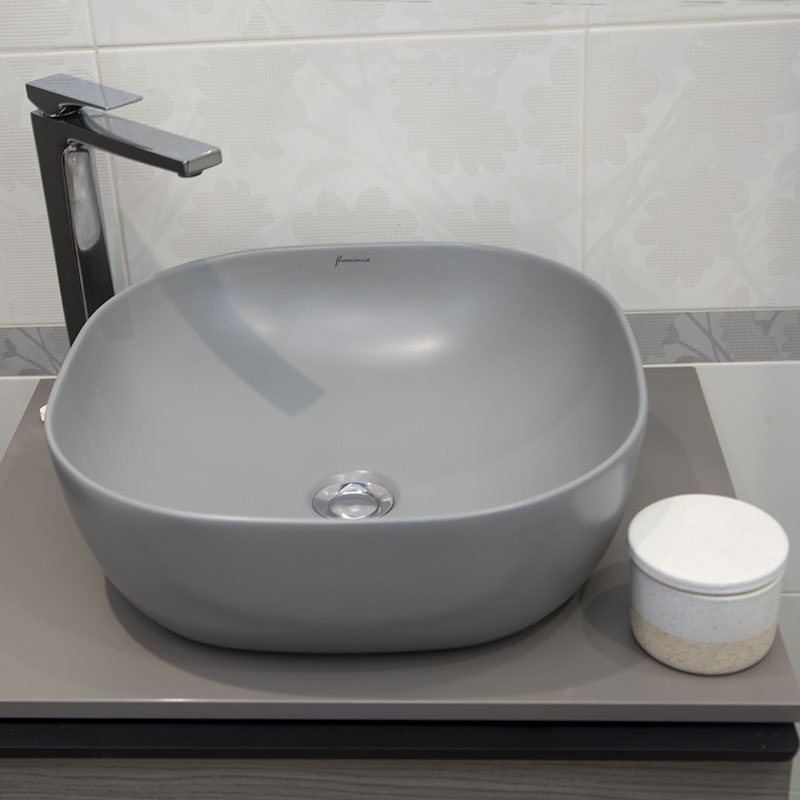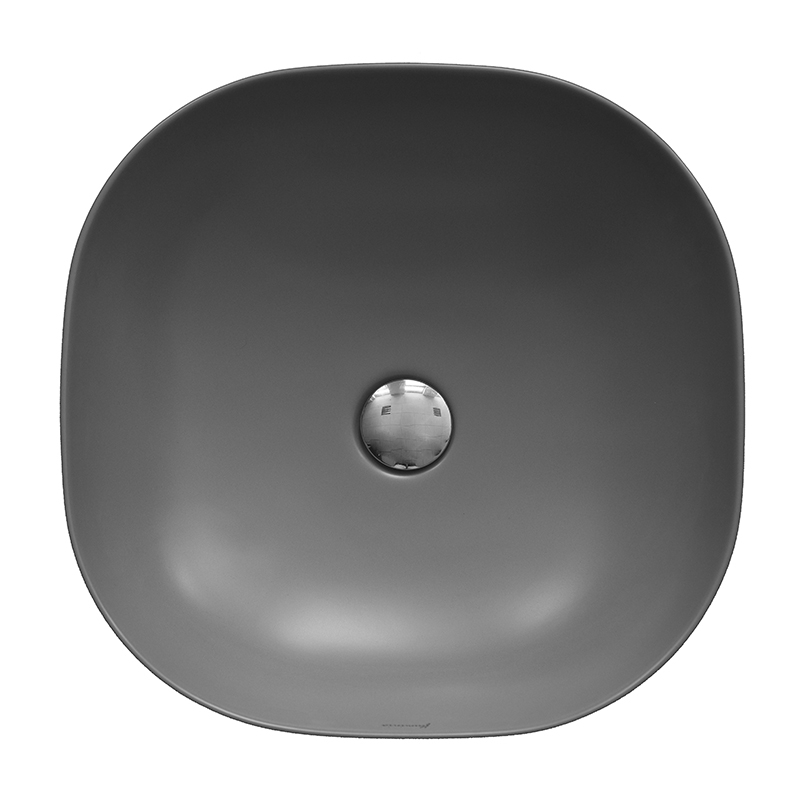Lavoar Fluminia Calio-MG, pătrat, gri mat, 42x42 cm, pentru montaj pe blat. Design modern, ceramică sanitară de calitate, fără orificiu pentru baterie și preaplin.