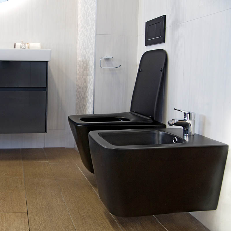 Set vas WC suspendat Fluminia Paris, 52,5x36,5x29,5 cm, ceramică sanitară negru mat. Include capac soft close și quick release. Design modern rimless, fixare ascunsă.